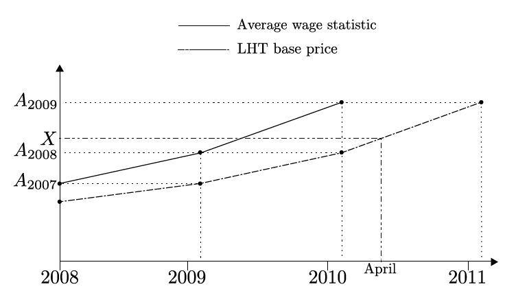 Например, в начале 2009 года наиболее свежей статистикой являются данные о средней цене часа труда за 2008 год. Цена LHT в начале 2009 года приравнивается к средней почасовой заработной плате в 2007 году и далее в течение года монотонно возрастает до уровня 2008 года. Таким образом, в начале 2010 года цена LHT будет равняться цене часа труда в 2008 году, а к началу 2011 года она возрастет до уровня 2009 года и т.д.