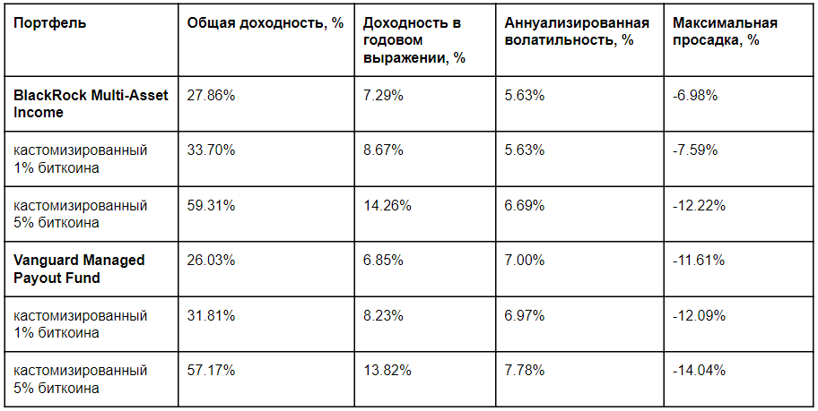 Тем не менее общая доходность за исследуемый период оказалась гораздо выше — +59.3% у BlackRock Multi-Asset Income и +57.2% у Vanguard Managed Payout Fund. Без включения BTC доходности составили 27.86% и 26.03% соответственно. Таким образом, интеграция биткоина в каждый из портфелей принесла бы прирост доходности около 7,5% в годовом выражении.