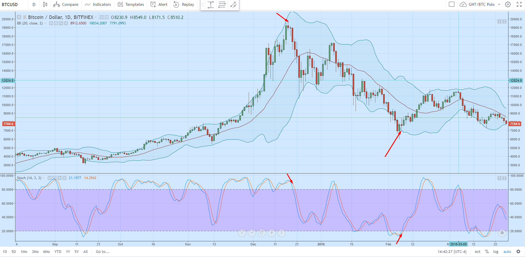 Также многие трейдеры используют Stochastic в паре с полосами Боллинджера: