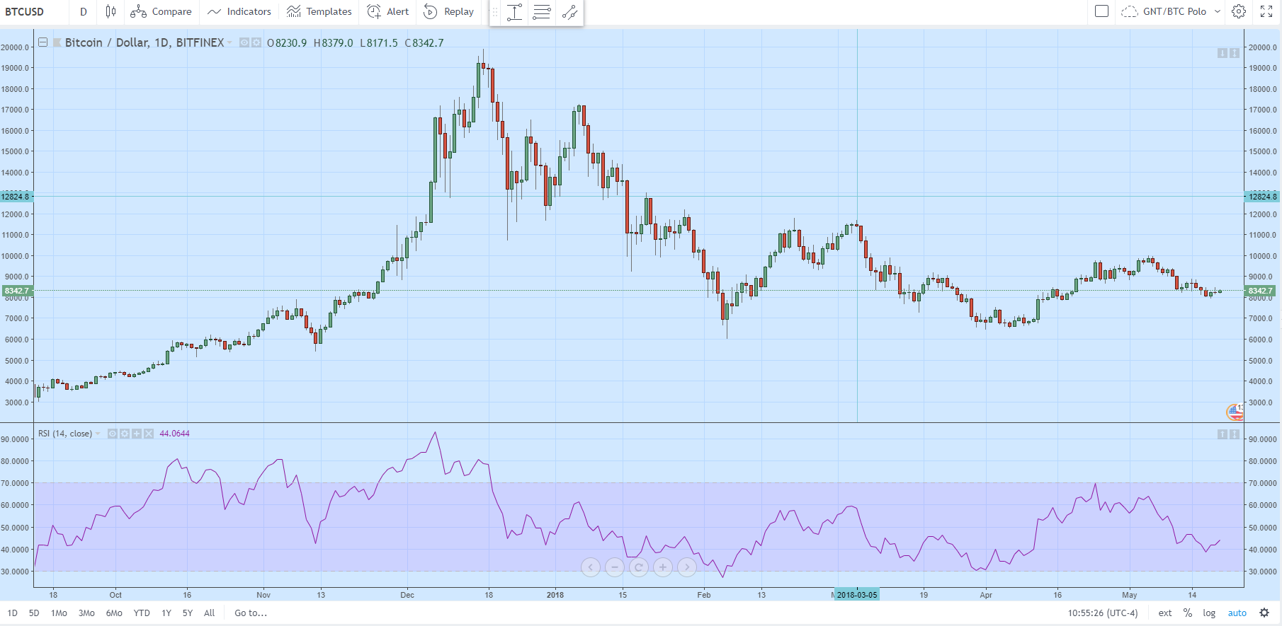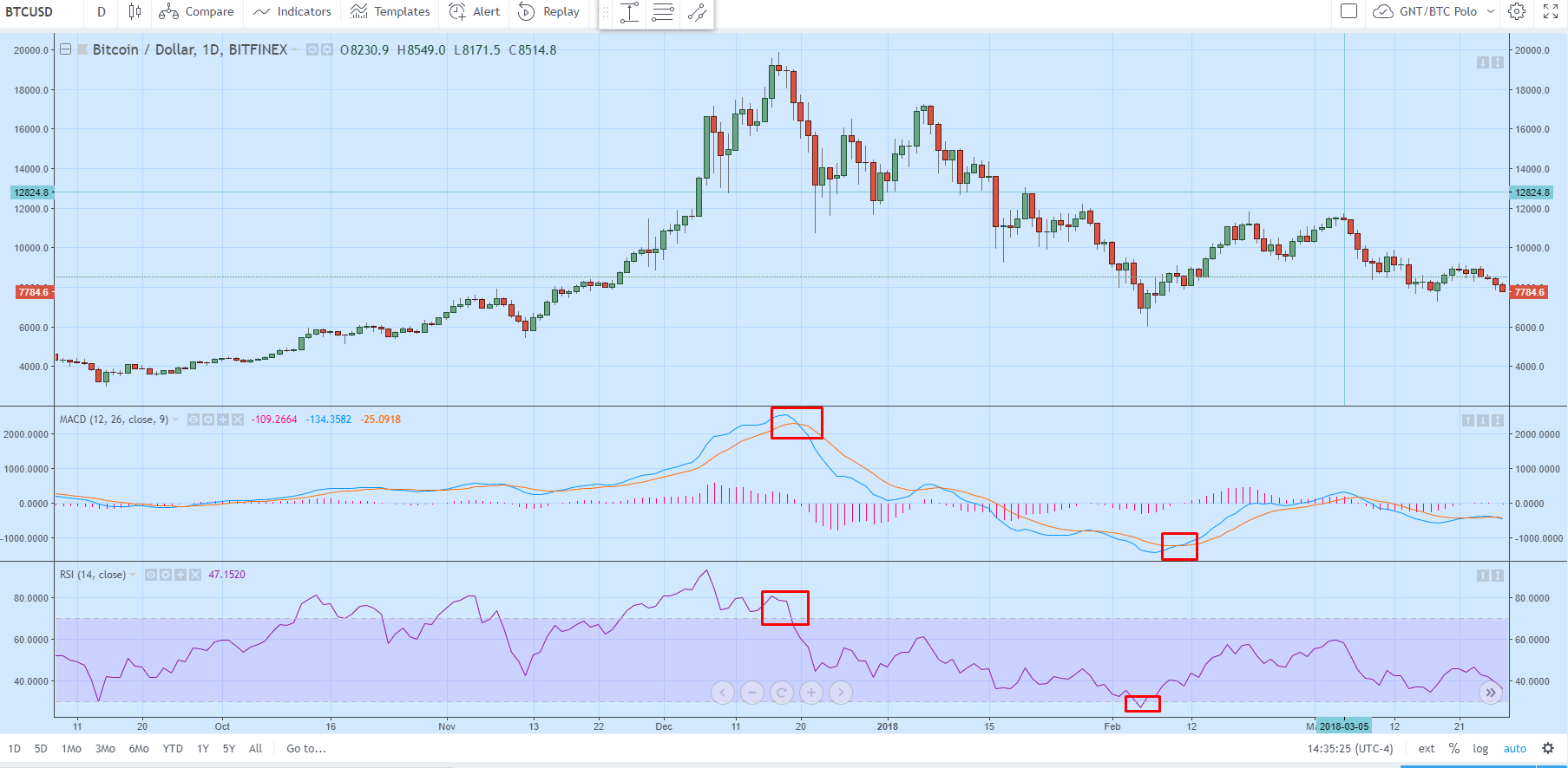 Кроме того, можно довольно удачно комбинировать индикатор MACD с осциллятором RSI. Ниже на графике можно увидеть, что в декабре прошлого года эти инструменты (пусть и с некоторым опозданием, но все же) указали на благоприятный момент для фиксации прибыли в паре BTC/USD.