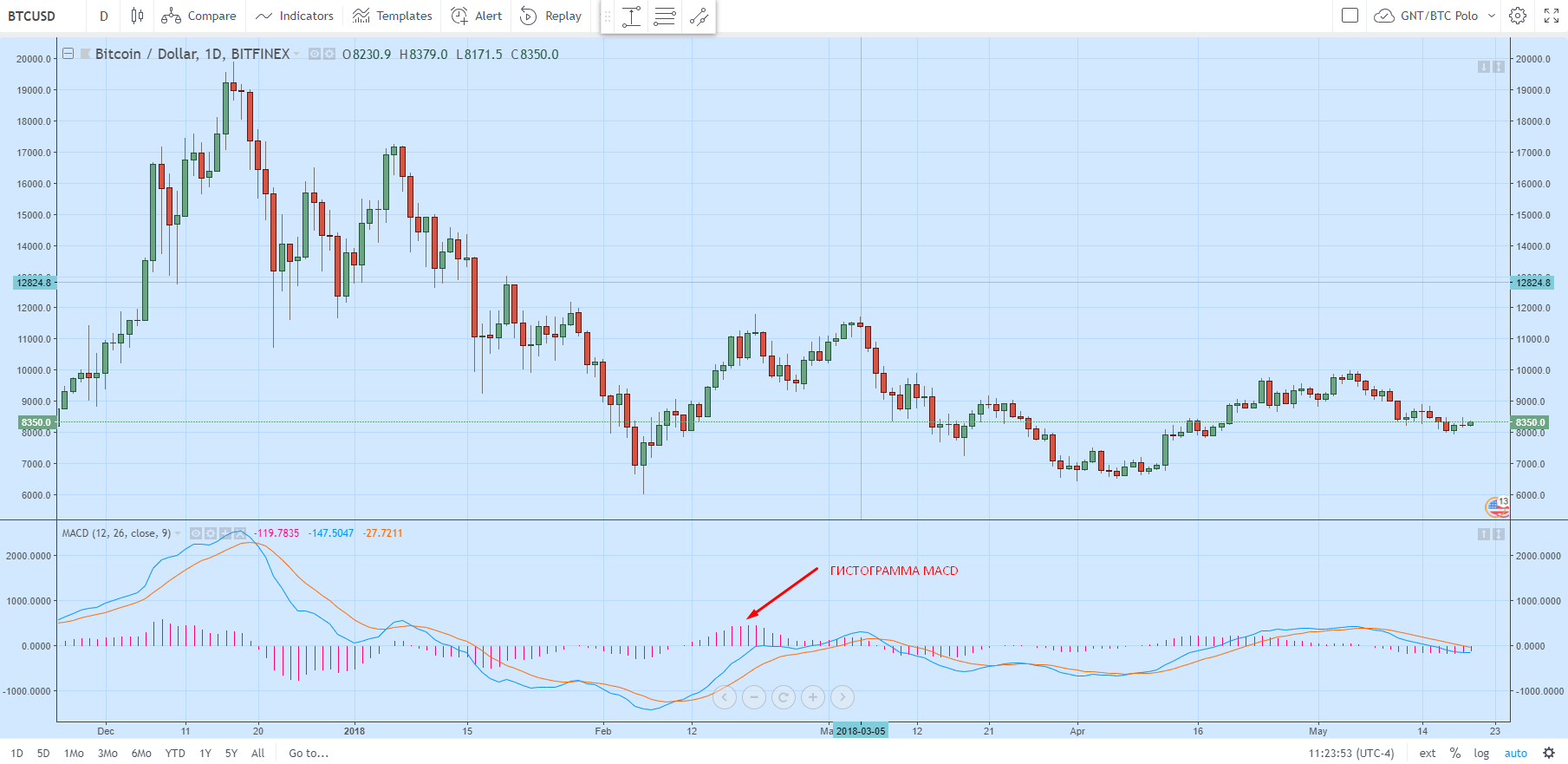 Самый простой вариант использования этого индикатора — когда синяя линия MACD пересекает оранжевую сигнальную линию. Как правило, одновременно с этим пересекает нулевой уровень и гистограмма MACD: