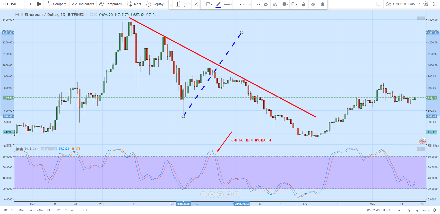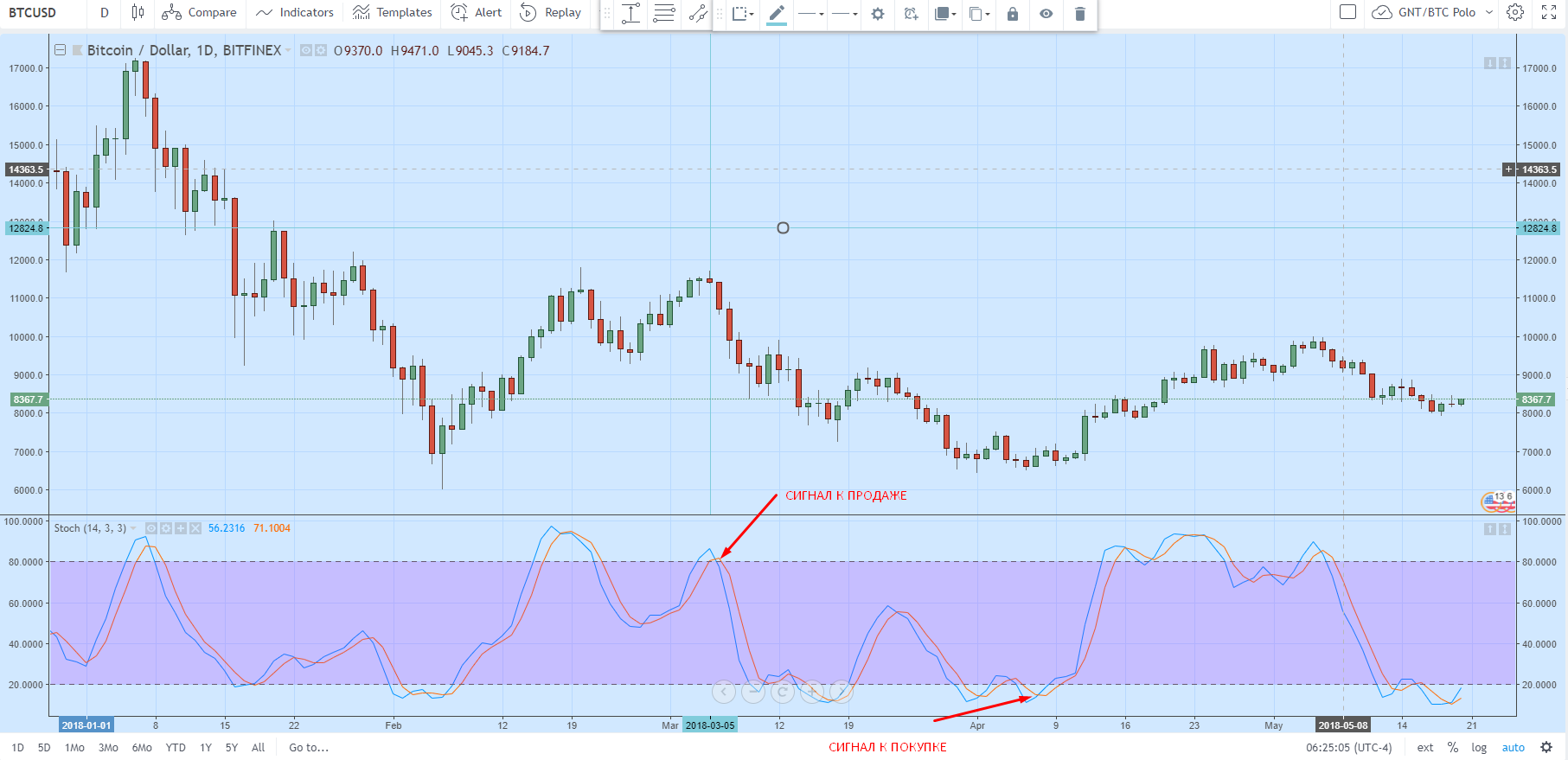 Стрелкой отмечен сигнал для продажи на индикаторе Stochastic в момент возвращения обеих линий из зоны перекупленности в диапазон ниже 80.