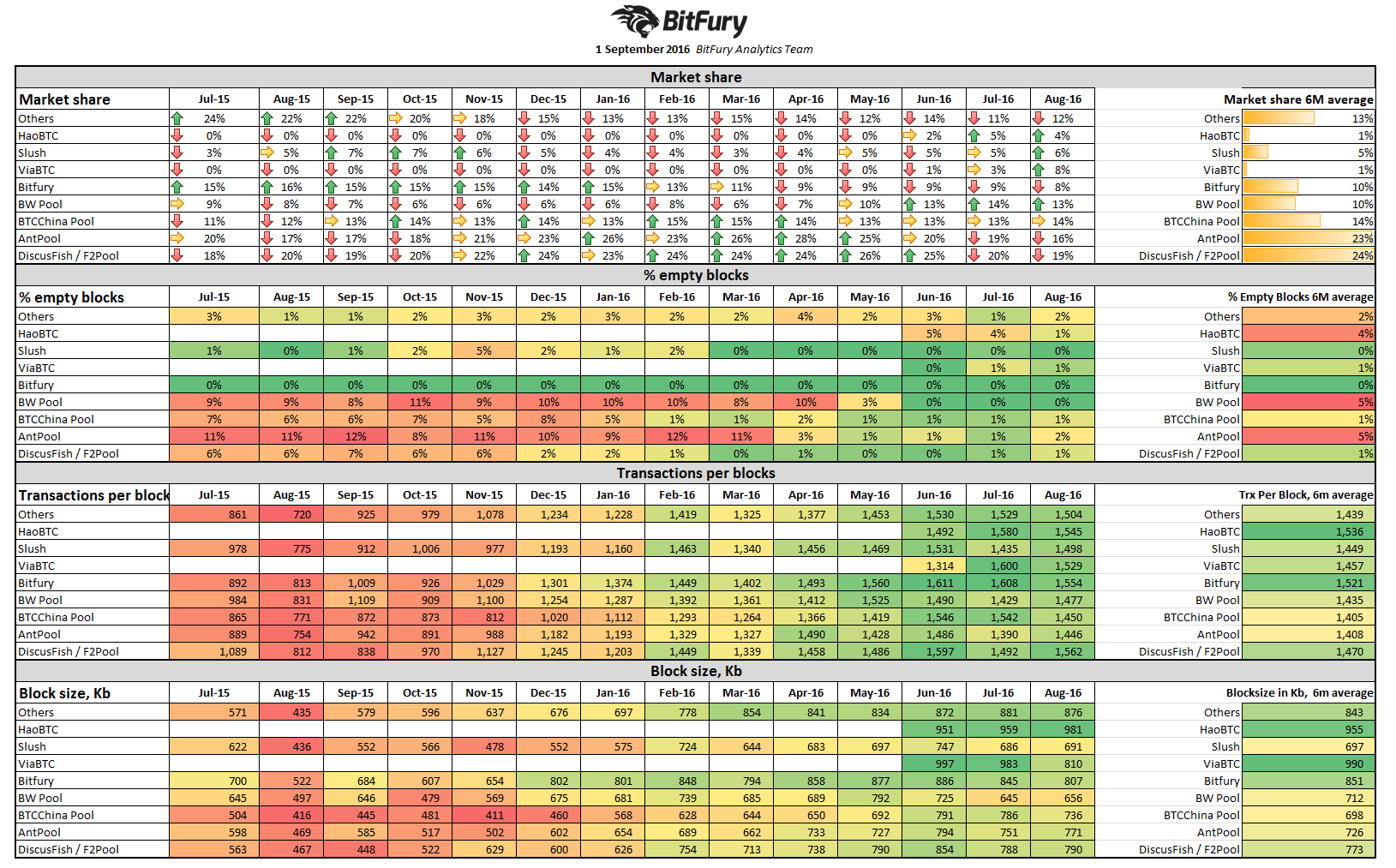 Также, по данным Bitfury, количество транзакций в блоке за последний год действительно увеличилось. Например, в сравнении с июлем 2015, количество транзакций в блоке по разным пулам увеличилось примерно в два раза. При этом многие пулы продолжают обрабатывать пустые блоки. Так, на август 2016 процент пустых блоков, добытых ключевыми пулами, составляет 8% от общего количества добытых блоков. Отметим, что в августе 2015 года этот же показатель составлял 33%.