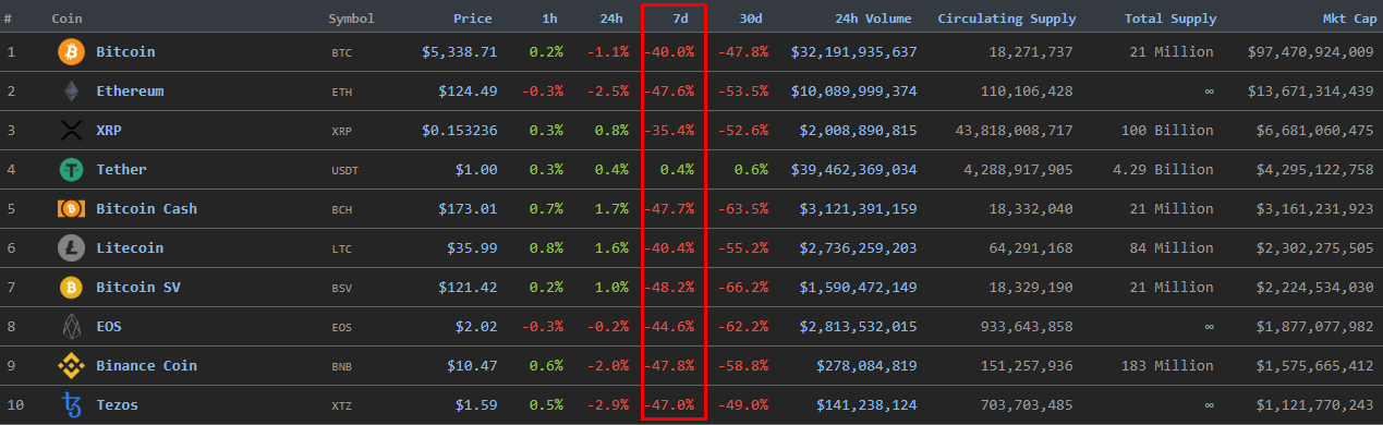 Как видно, цена биткоина и других популярных монет просела на 40% и более.