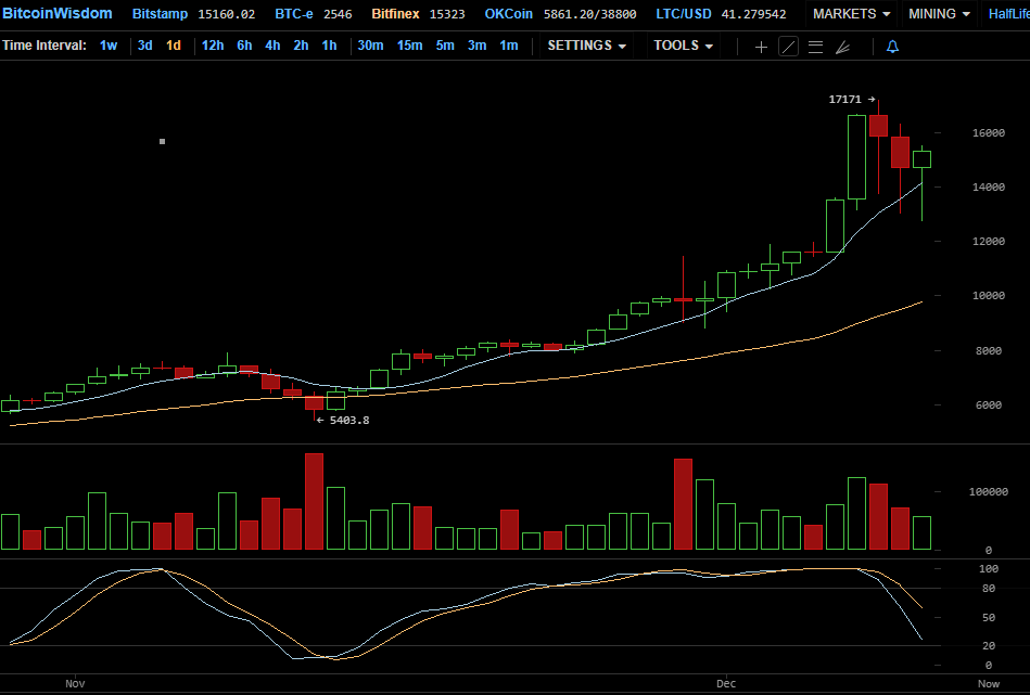 На дневном графике биржи Bitfinex видно, как в начале недели цена биткоина заметно ускорила восходящее движение. Затем, вскоре после достижения пикового значения на отметке $17 171, цена криптовалюты начала стремительную коррекцию.