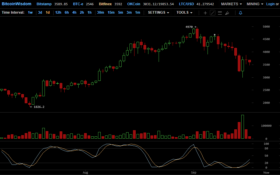 На дневном графике биржи Bitfinex можно наблюдать ярко выраженное, почти непрекращающееся падение цены первой цифровой валюты. В пятницу, 15 сентября, курс биткоина предпринял попытку выйти из глубокой перепроданности и хотя бы частично восстановить утраченные позиции. Однако, уже на следующий день постепенное падение цены продолжилось и в настоящий момент криптовалюта торгуется в районе $3580. В целом, за последние две недели биткоин подешевел почти на 30%.