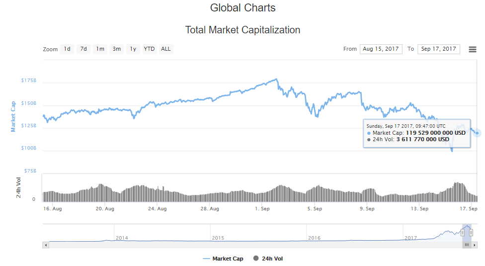 Что касается капитализации рынка, то еще две недели назад совокупная стоимость криптовалют превышала $170 млрд. В настоящий же момент этот показатель составляет $119 млрд.