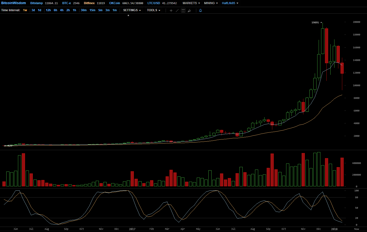 На протяжении всей уходящей недели цена биткоина в целом демонстрировала снижение. Так, на недельном графике видно, что последняя свеча закрылась значительно ниже предыдущей: