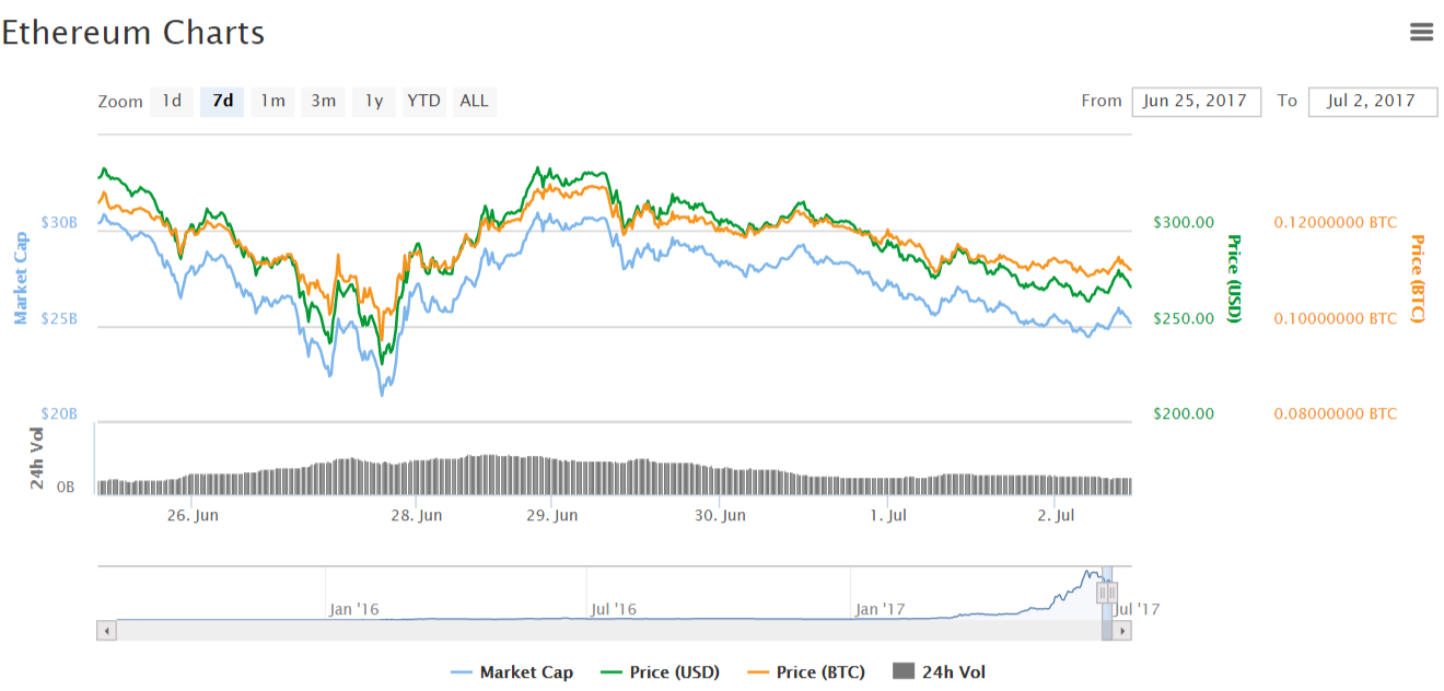 Полностью оправиться цена Ethereum, однако, так и не смогла. Лишь начиная со среды, достигнув перед этим нижней точки в $230, она снова пошла вверх и вернулась к показателям понедельника (около $330). В последующие дни, впрочем, курс ETH опять пошел вниз и на момент публикации составляет $271.