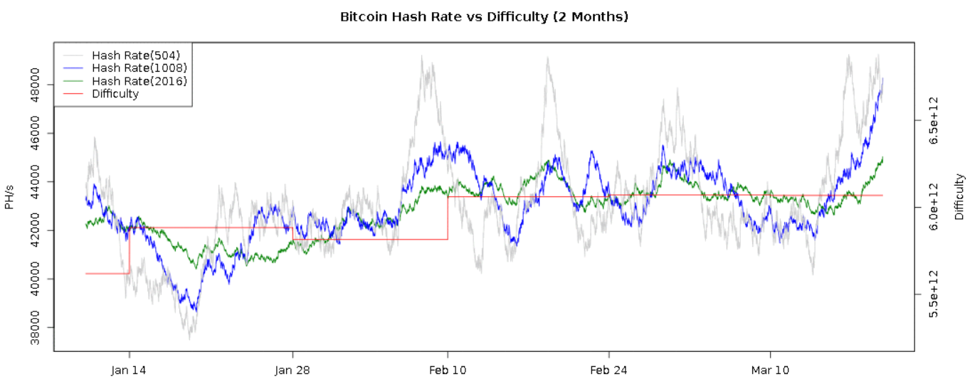 В то же время сложность биткоина, несмотря на возросший хешрейт, остается пока на уровнях начала февраля.