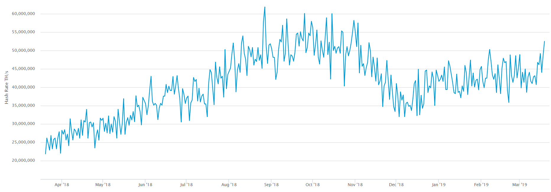 Так, согласно данным Blockchain.com, во вторник, 19 марта этот показатель составлял более 52 EH/s.