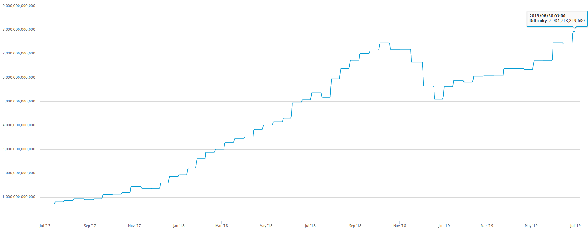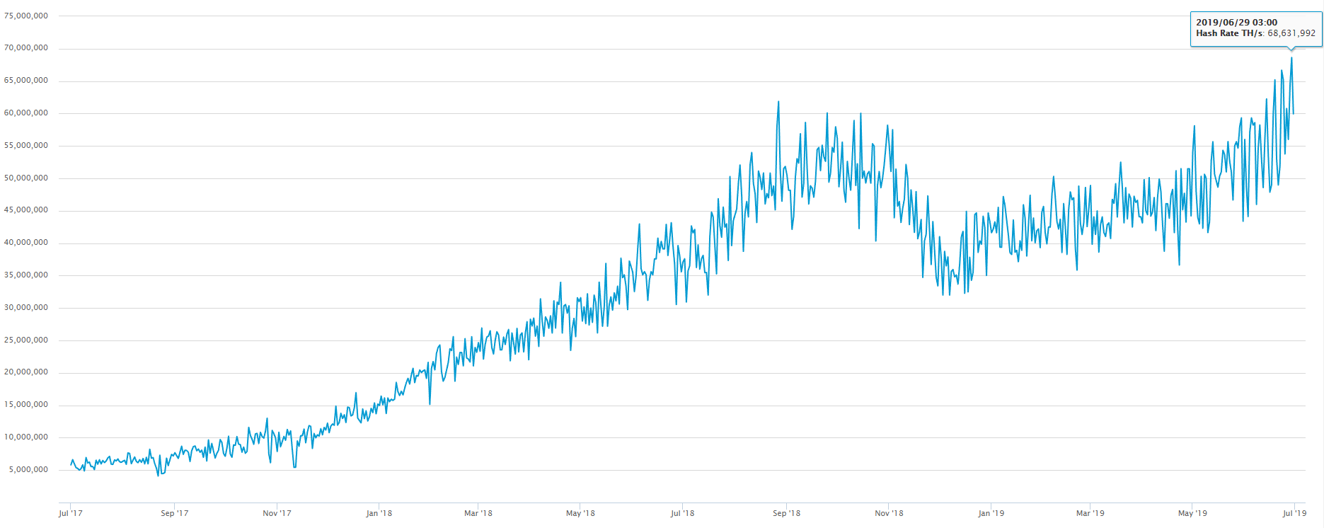 Рекордно высокий показатель был зафиксирован 28 июня. После того хешрейт немного снизился, однако, как это видно по графику, тренд явно на повышение.