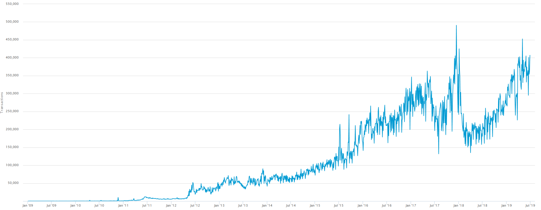 Ежесуточно, по данным blockchain.com, в основной сети первой криптовалюты проходит более 400 тысяч транзакций