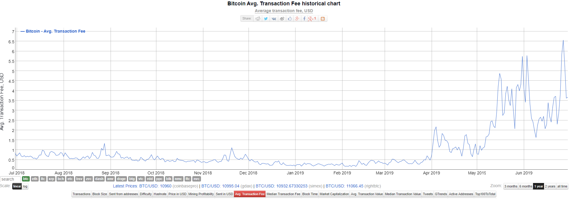 У высокой блокчейн-активности в сети биткоина есть и обратная сторона медали — внушительные транзакционные комиссии. Так, в середине прошлой недели средний размер комиссии превысил $6: