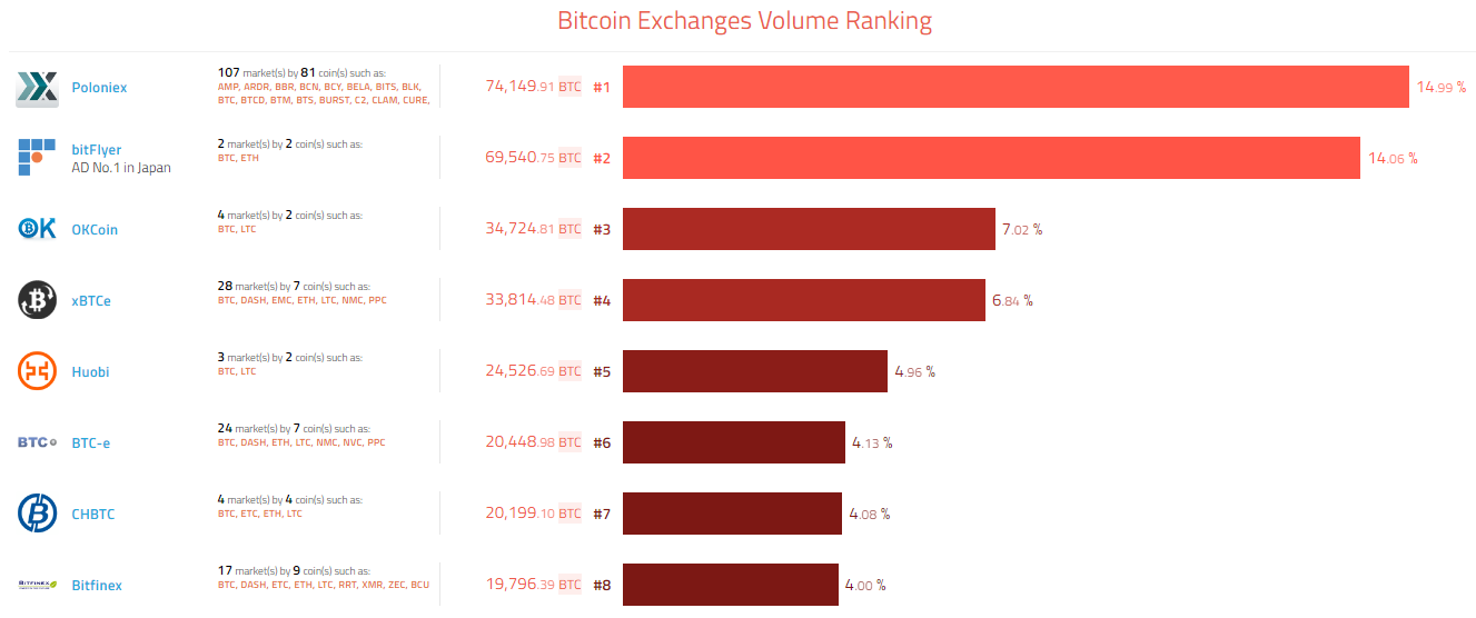 Среди криптовалютных бирж лидером по объему торгов является Poloniex, за ней следом располагаются японская bitFlyer и китайская OKCoin: