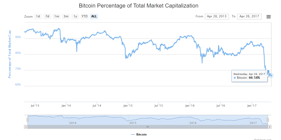 Капитализация биткоина приближается к $21 млрд. Его доля в глобальном рынке криптовалют составляет 66,58%, что является рекордно низким значением.
