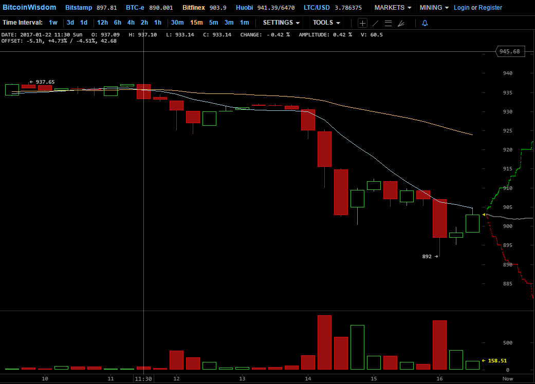 Рынок практически моментально отреагировал на эту новость резким снижением цены — если в первой половине дня в воскресенье курс биткоина после субботнего роста доходил до $940, в дальнейшем стоимость криптовалюты стремительно пошла вниз. В какой-то момент курс опускался почти до $890, на момент публикации биткоин торгуется в районе $900.