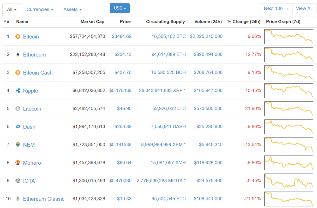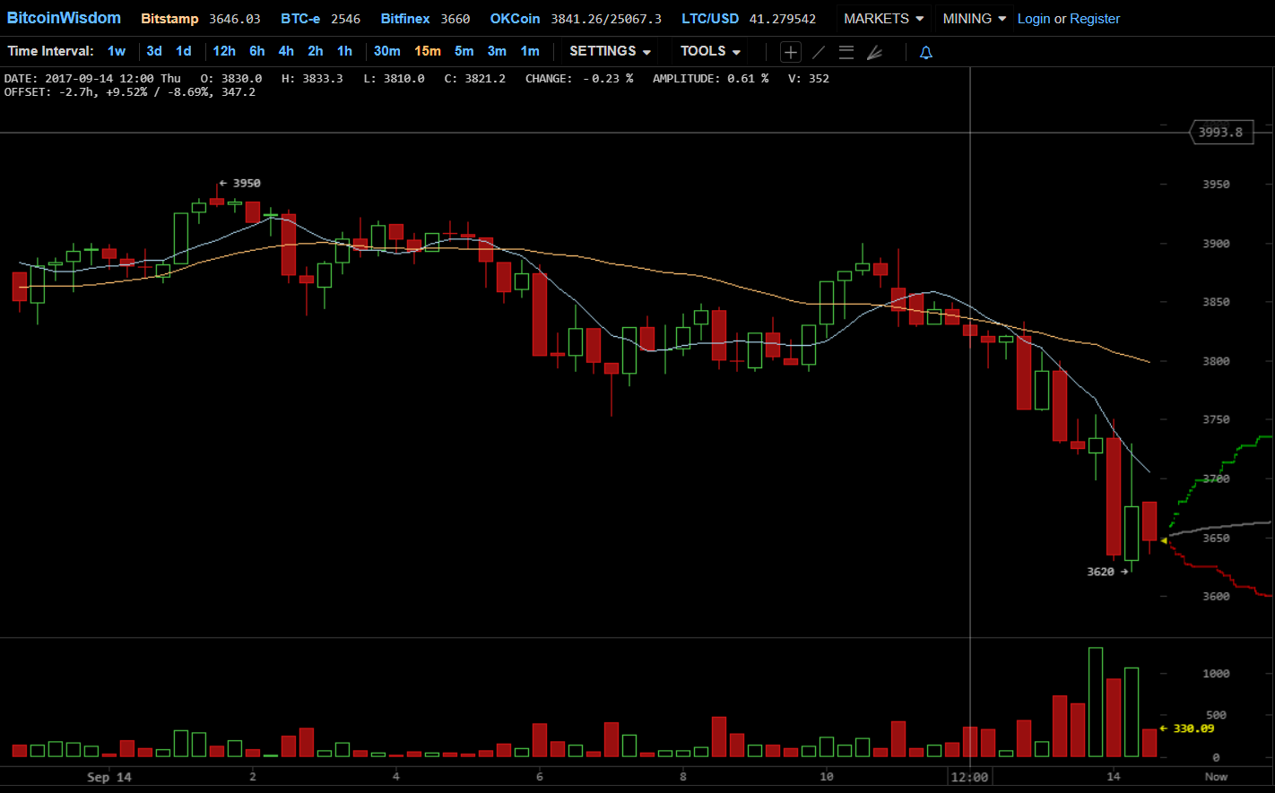 Апдейт 2: По состоянию на 13:00 UTC цена биткона на ряде бирж упала ниже $3500. Также падают и другие криптовалюты: Ethereum опустился ниже $240, до $46 упала цена Litecoin.