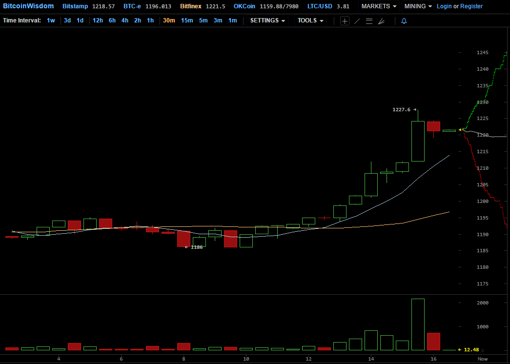 Так, снова был обновлен исторический рекорд на биржах Bitfinex ($1227) и Bitstamp ($1222), одновременно с этим выросла до $19,523 млрд рыночная капитализация биткоина (данные по состоянию на 14:30 GMT).