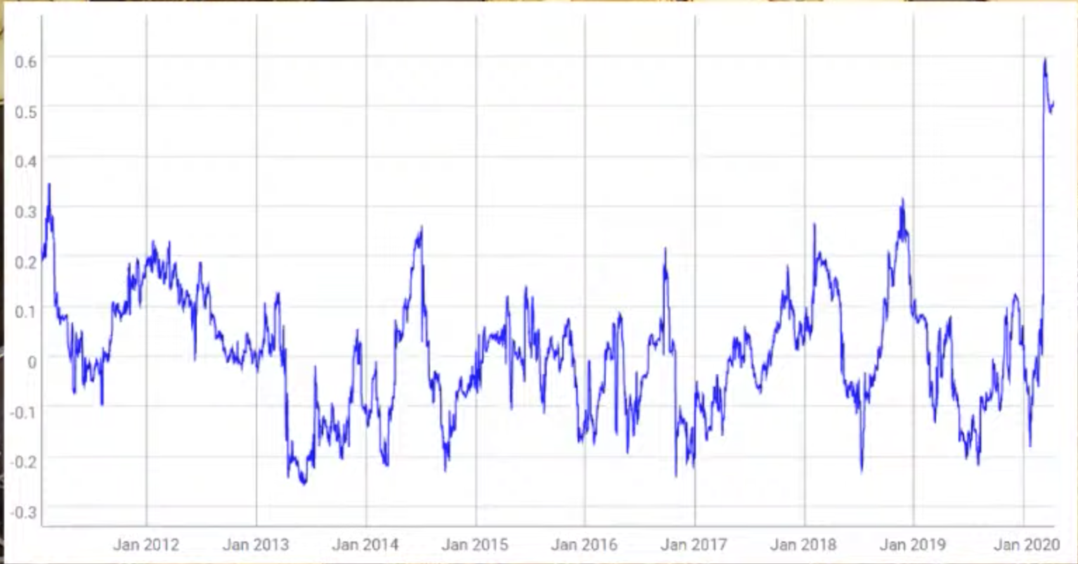 На нем видно, что корреляция BTC и S&P 500 в начале текущего года вплотную подобралась к недостижимой ранее отметке 0,6. До этого самые высокие значения показатель достигал еще в далеком январе 2011 года, ненадолго преодолев значение 0,3.