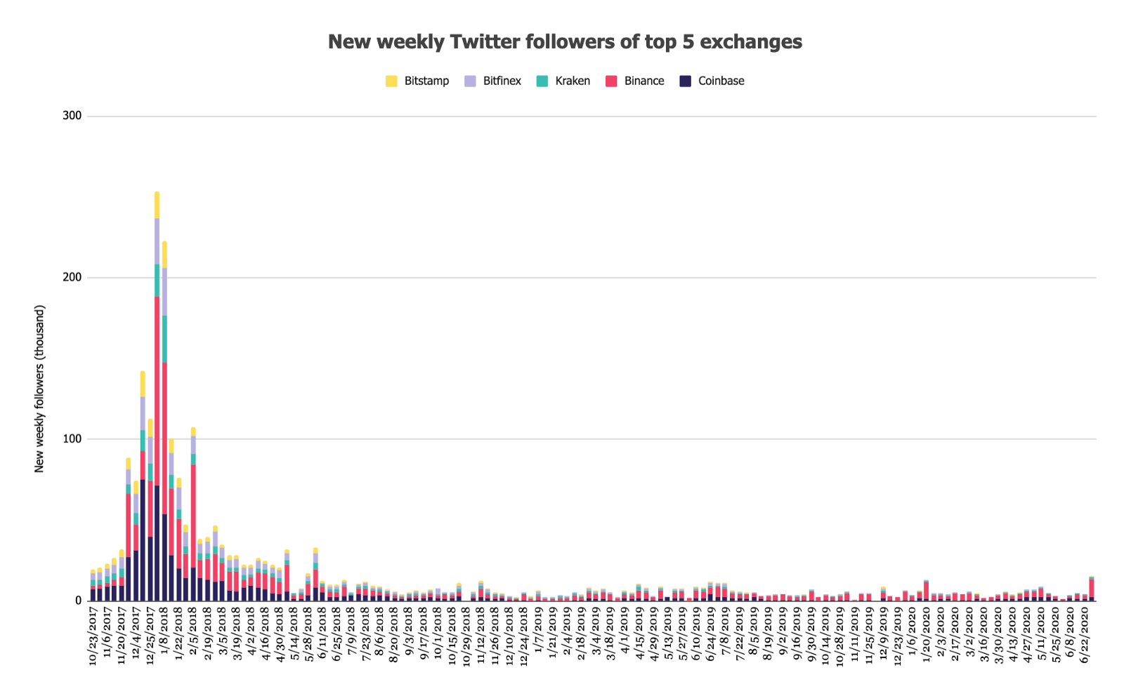 Среднее число новых еженедельных подписчиков Twitter пяти ведущих биткоин-бирж в этом году составляет более, чем в 50 раз меньшую величину от пикового значения в первую неделю 2018 года — 5 340 против 254 тысяч.