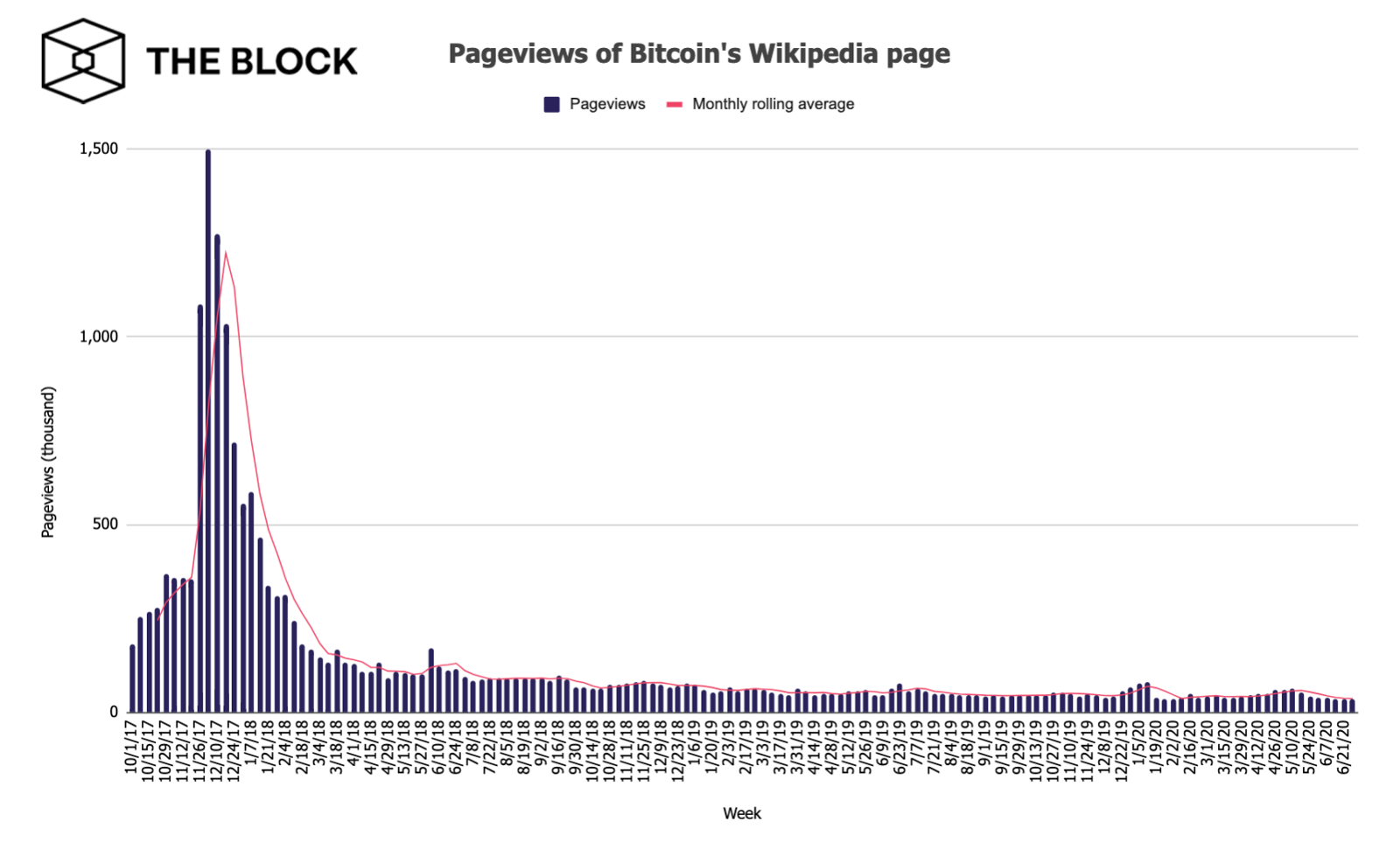 В 31 раз ниже число просмотров странички, посвященной первой криптовалюте в Wikipedia — 48 тысяч в этом году против 1,5 млн на неделе с 27 ноября по 3 декабря 2017 года.