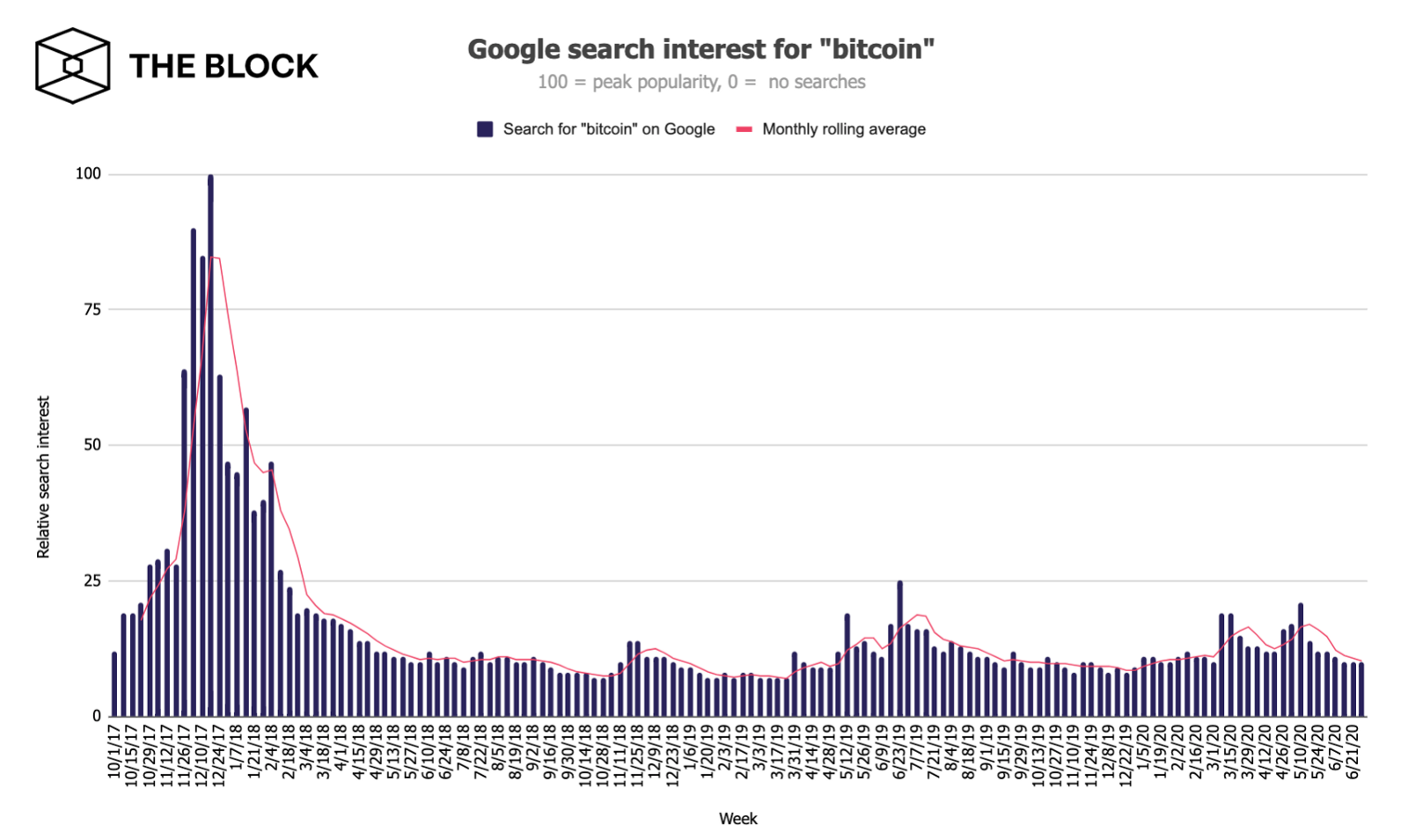 Количество поисковых запросов «биткоин» в Google в 2020-м году в восемь раз меньше показателя, наблюдавшегося в декабре 2017 года.