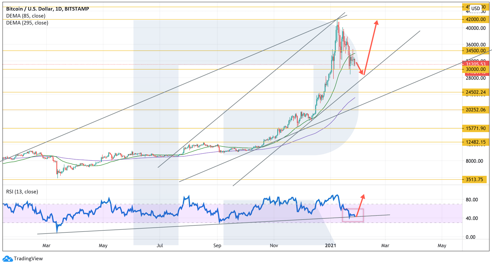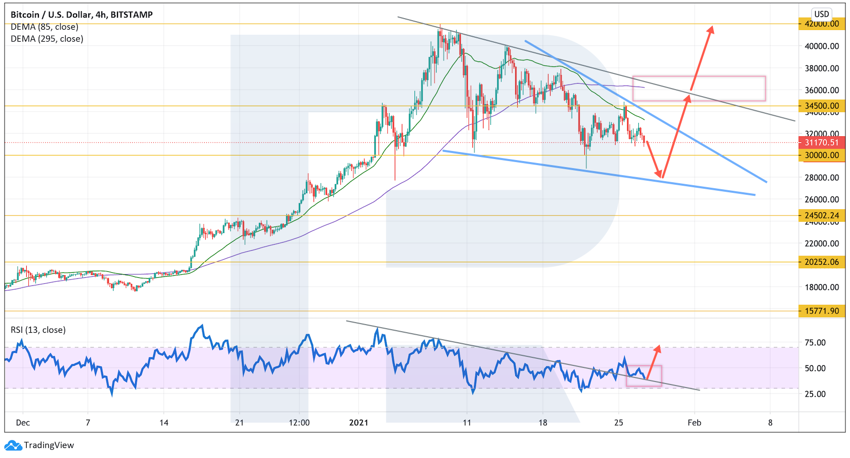 На 4-часовом графике значения индикатора RSI впервые с момента развития коррекции от уровня $42 000 пробили нисходящую линию тренда. Это может выступать сигналом к ее завершению и возобновлению ценового подъема. В этом случае ближайшей целью роста выступит уровень $34 500.