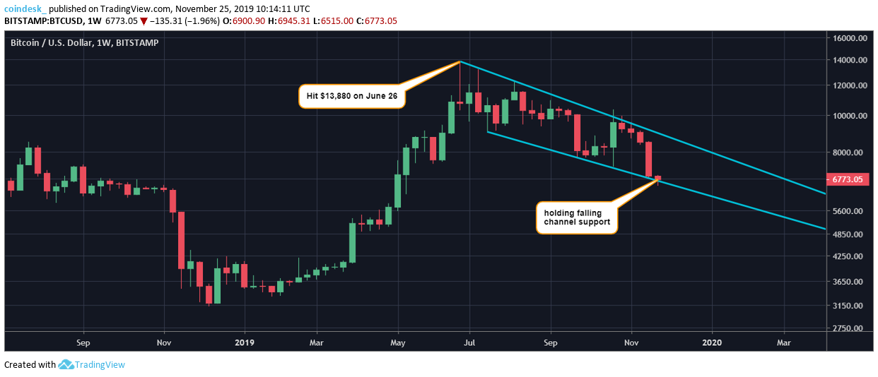На недельном графике видно, что цена тестирует нижнюю границу нисходящего канала, следующего от июньского максимума на отметке $13 880: