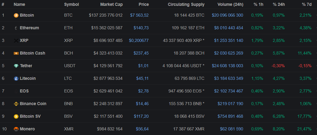 В течение последние семи дней эфир рос быстрее биткоина, XRP, Litecoin, EOS и Binance Coin: