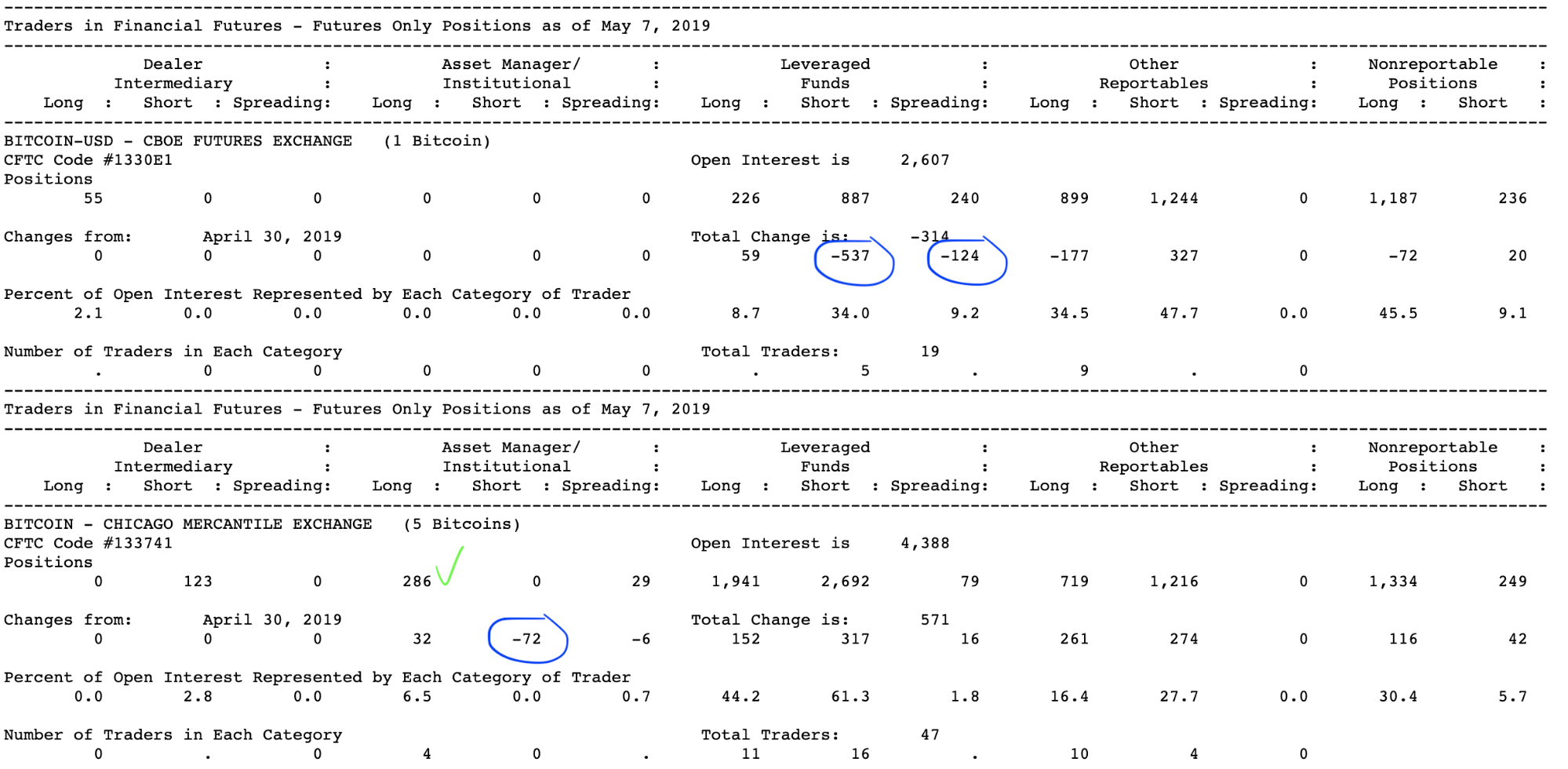 Давайте пробежимся по текущему отчету и посмотрим, насколько сильно изменилась ситуация. Прежде всего отмечу, что по данным CBOE больше не выходит COT-отчет по BTC. Биржа на некоторое время решила прекратить поддержку фьючерсов на биткоин. Посмотрим как изменится их мнение после текущего ралли. Вполне вероятно, что деривативы от CBOE скоро вернутся конкурировать с CME.