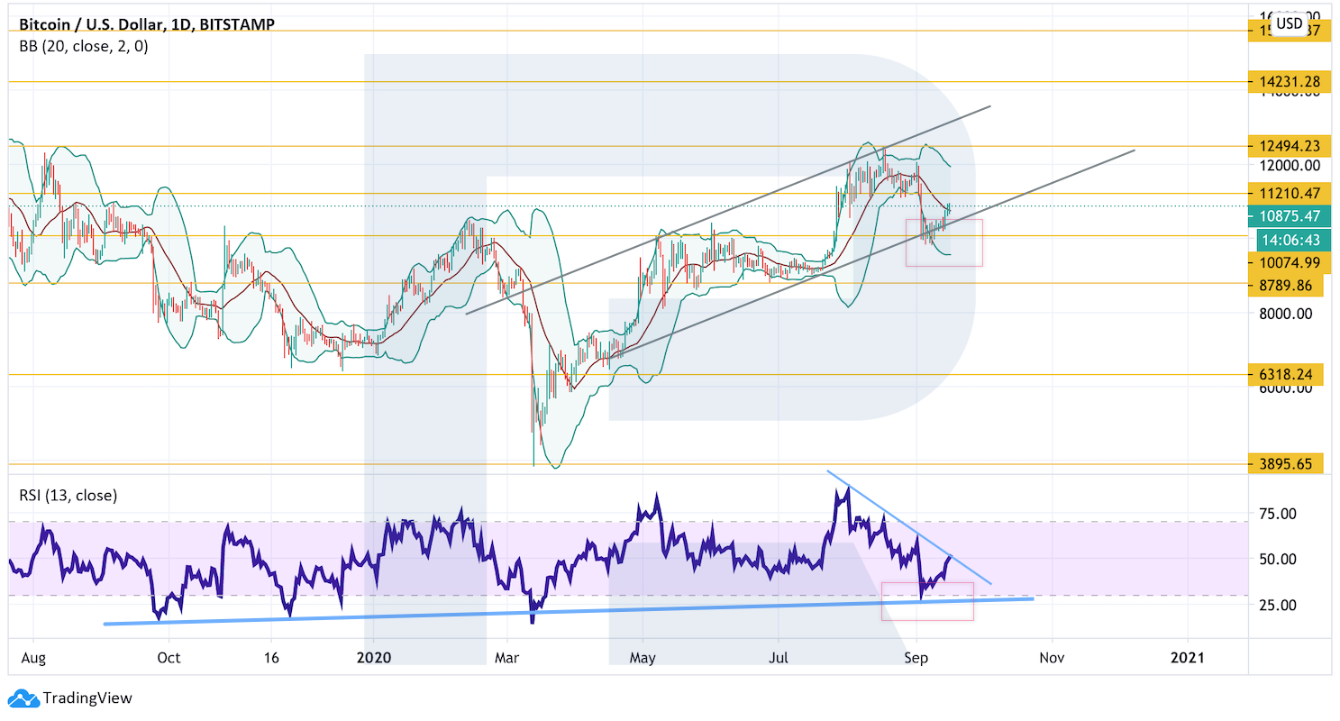 На дневном графике стоимость биткоина вновь оттолкнулась от важной поддержки. Медведям не удалось пробить уровень $10 000, что указало бы на дальнейшее падение к $8000. Значения индикатора RSI также оттолкнулись от линии поддержки, что предполагает начало роста стоимости актива к уровню $12 495. Пробой данной отметки укажет на продолжение подъема к $14 230.