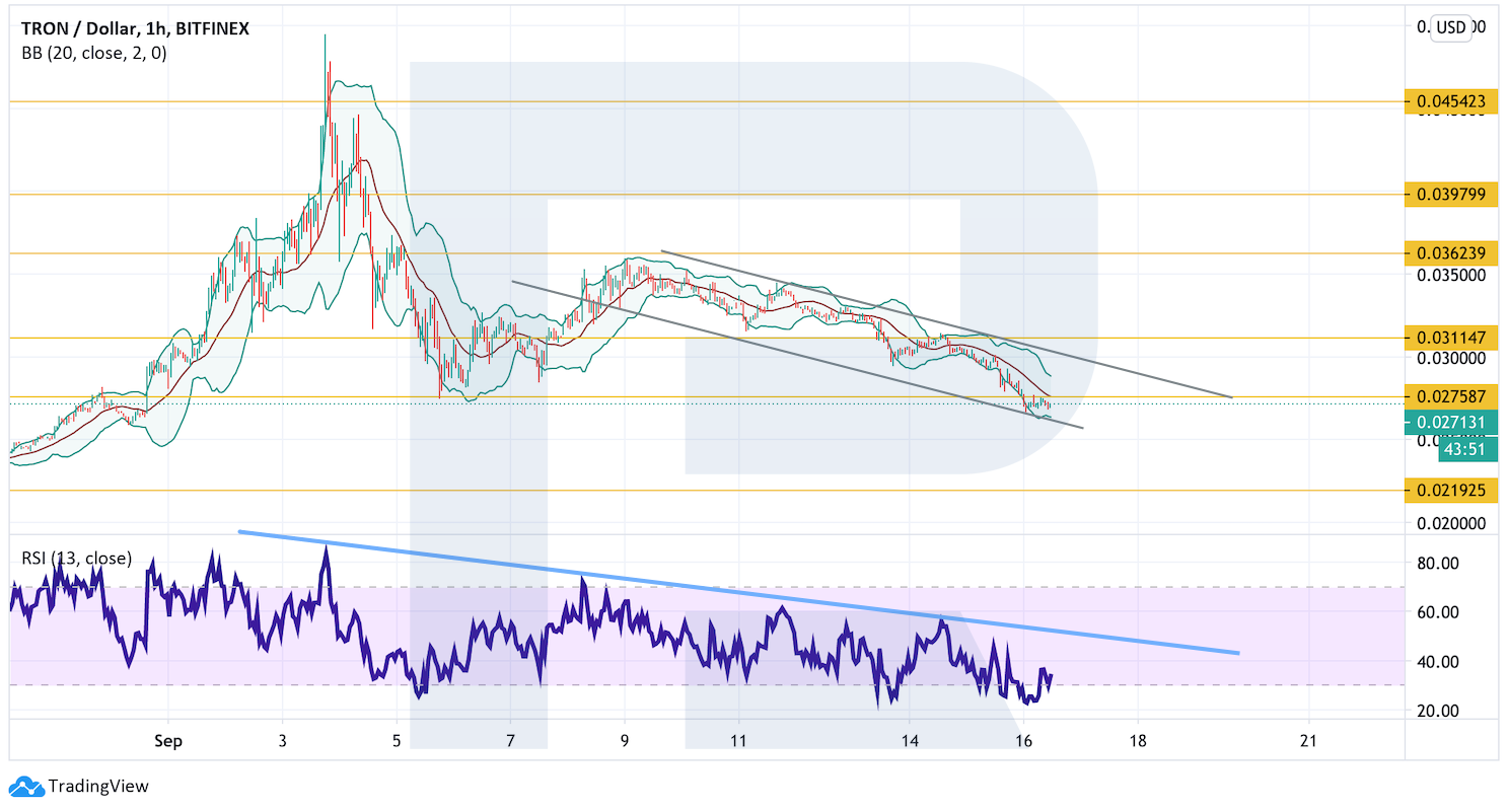 На более мелких временных промежутках цена актива также снижается в рамках нисходящего канала. Сохраняется потенциал для падения к уровню $0,0210. Сильным сигналом в пользу такого варианта выступают постоянные отскоки от нисходящей линии тренда на индикаторе RSI. Отменой негативного варианта станет пробой верхней границы нисходящего канала с закреплением котировок над уровнем $0,0310, где можно рассматривать продолжение подъема к $0,0360.