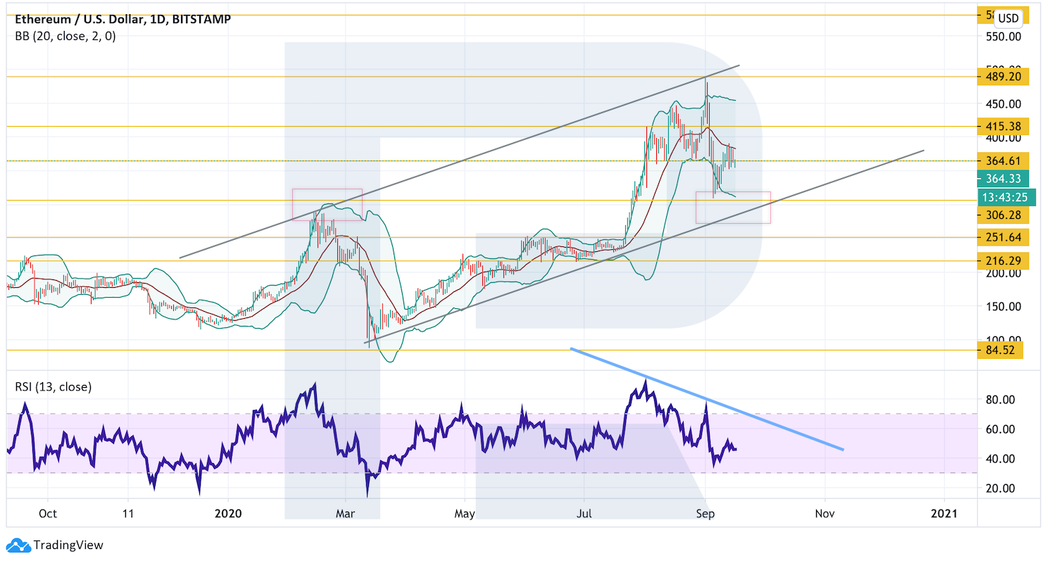 Котировки ETH/USD на дневном графике смогли оттолкнуться от нижней границы индикатора Bollinger Bands, однако пробой средней линии пока не состоялся. Такой сигнал указывал бы на полноценное возобновление восходящей тенденции.