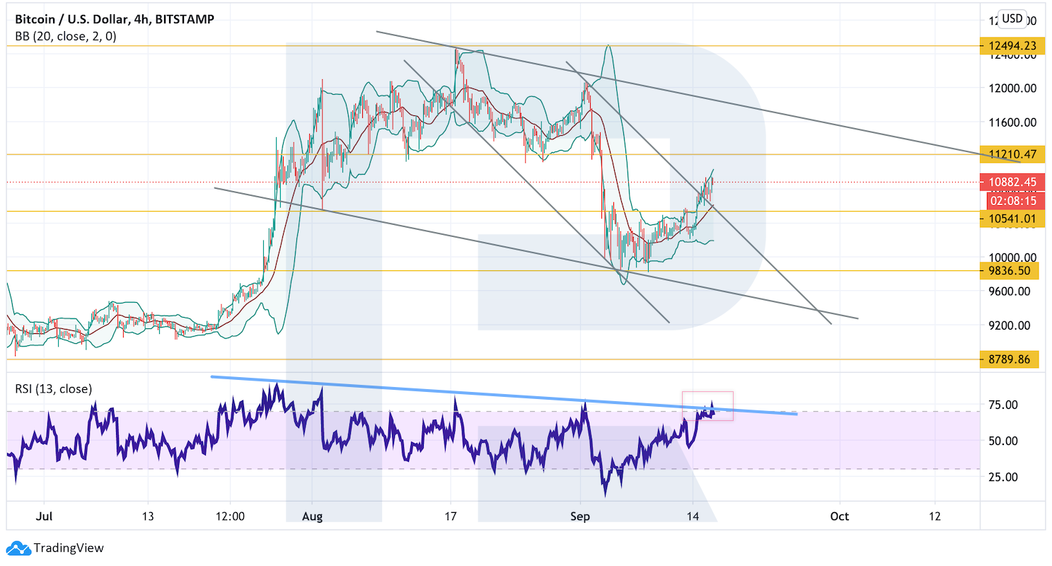 На 4-часовом графике цена покинула пределы нисходящего канала, однако значения индикатора RSI тестируют линию сопротивления. По этой причине пока не стоит исключать еще одной попытки снижения к уровню $10 540 с последующим движением вверх. Сильным сигналом в пользу варианта с продолжением развития бычьего импульса выступит пробой верхней границы большого нисходящего канала с закреплением цены над уровнем $12 005.