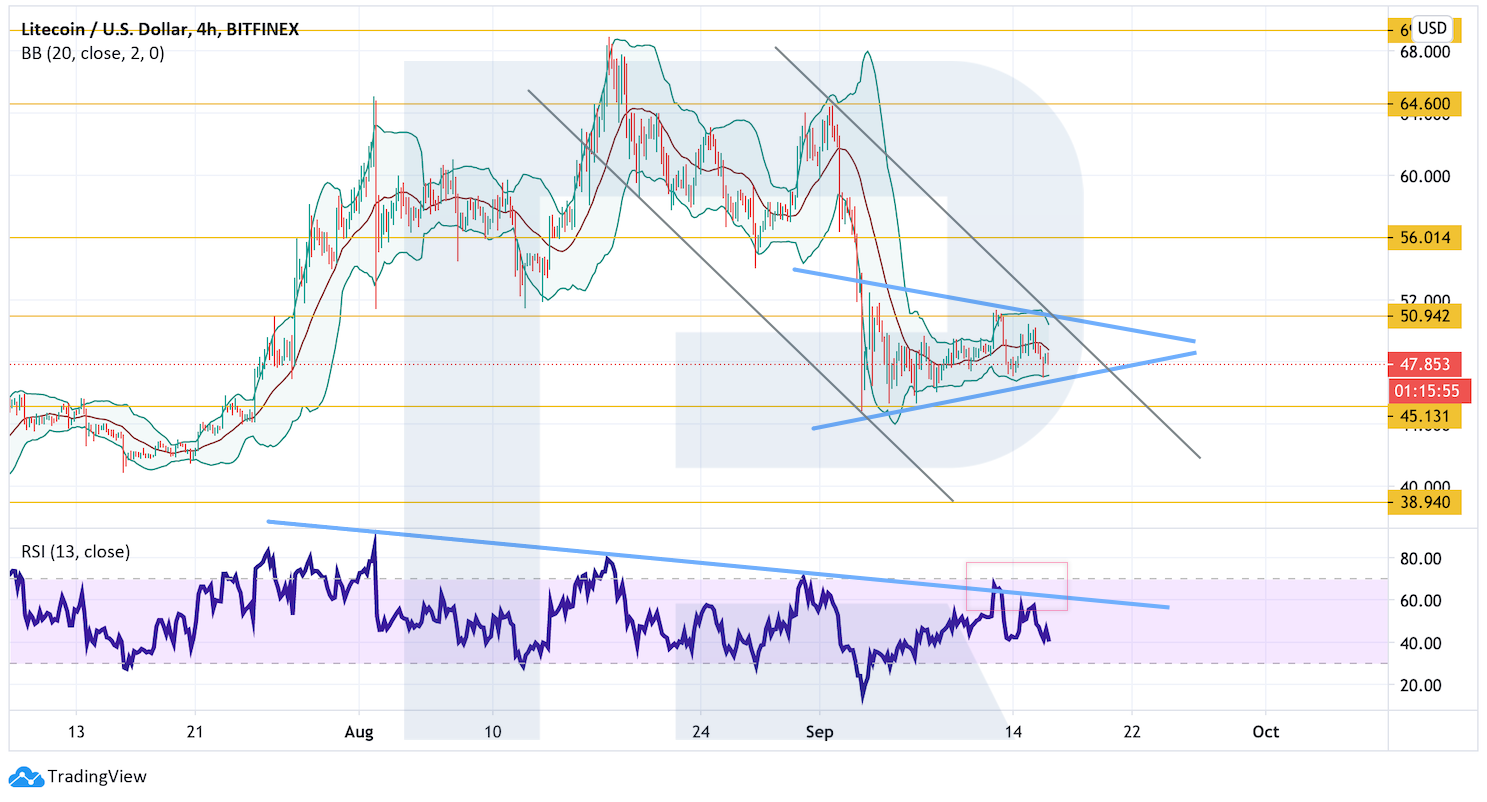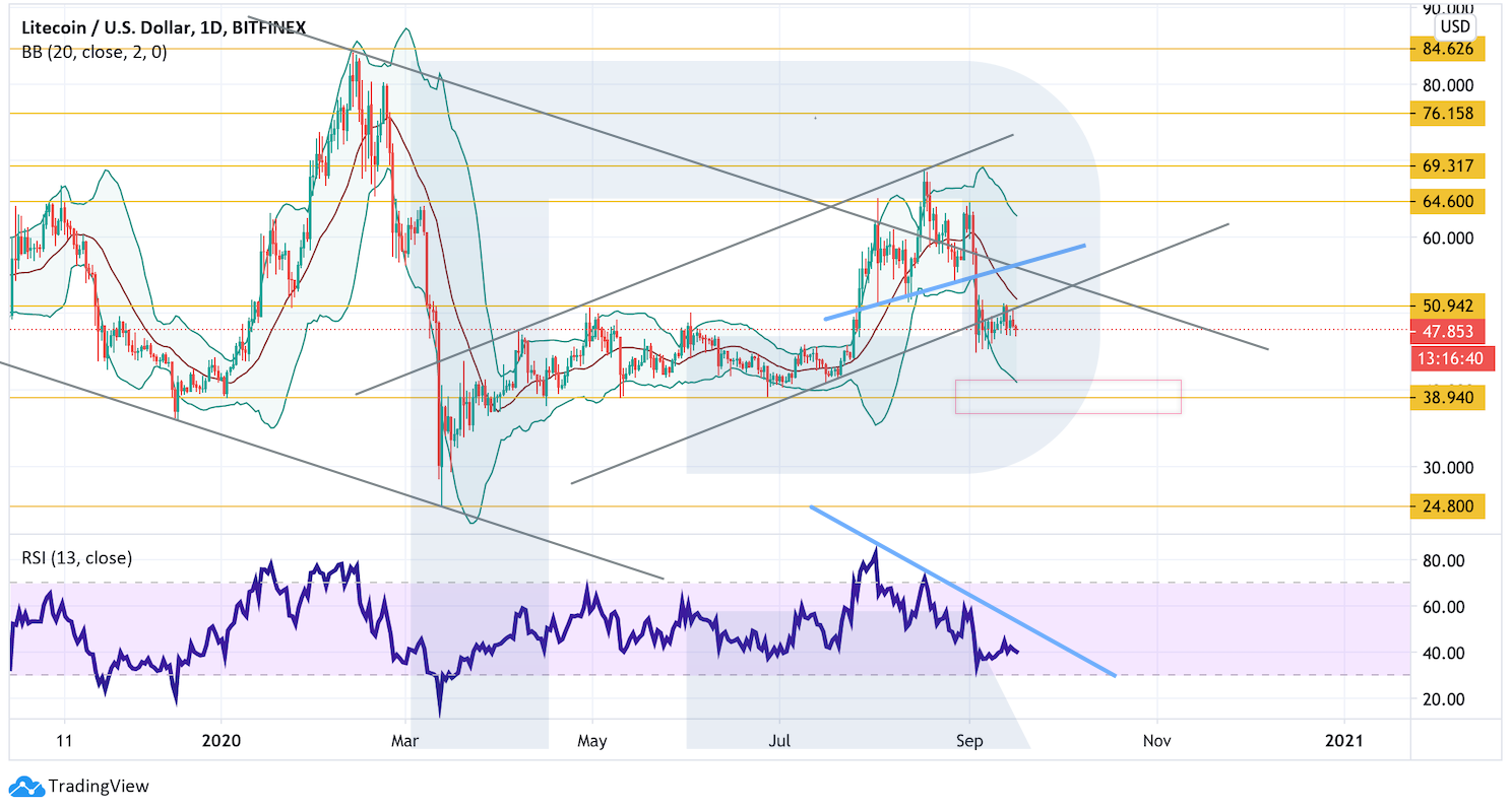 Котировки Litecoin на дневном графике продолжают корректироваться в рамках отработки модели «Голова и плечи». Целью падения по-прежнему выступает уровень $38. Сигналов к росту пока нет. Линия сопротивления на индикаторе RSI не пробита, а значения индикатора даже не пытались ее протестировать.