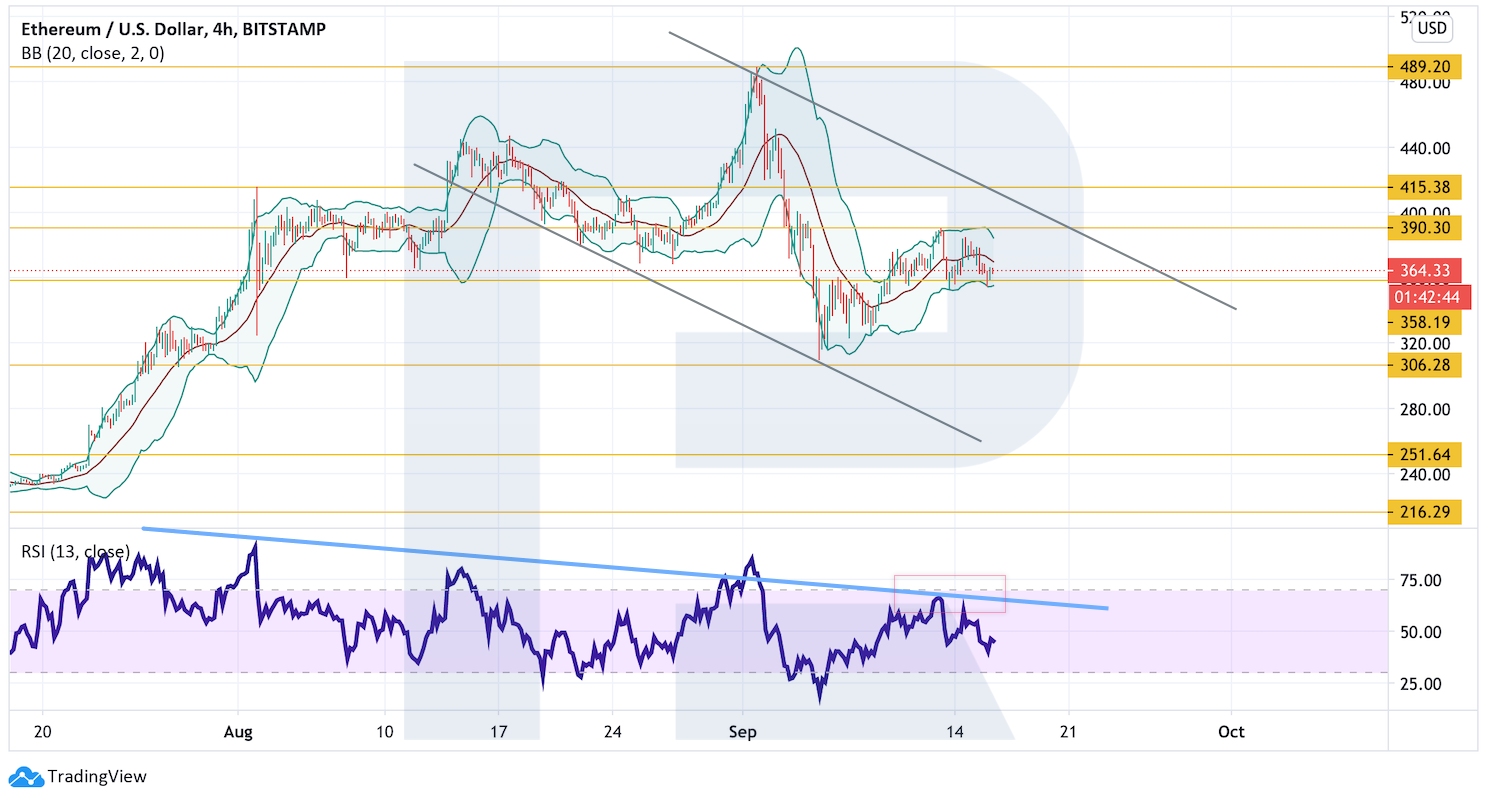 На более мелких временных промежутках цена растет в рамках нисходящего канала. Пока не состоялись пробой его верхней границы и закрепление цены над уровнем $415, говорить о продолжении роста уже с текущих уровней преждевременно. Более того, значения индикатора RSI тестируют линию сопротивления, что может спровоцировать падение актива к уровню $306, а его пробой укажет на продолжение снижения к $251.