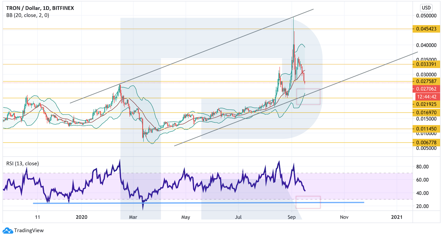 На дневном графике котировки TRON корректируются, однако остаются в рамках восходящего канала. Есть потенциал для тестирования его нижней границы на уровне $0,0210 и продолжения подъема цены. Дополнительным сигналом в пользу такого варианта выступит отскок от линии поддержки на индикаторе RSI. Отменой варианта с ростом может стать пробой нижней границы канала и закрепление котировок под уровнем $0,0170, в случае чего можно рассматривать их падение до уровня $0,0110.