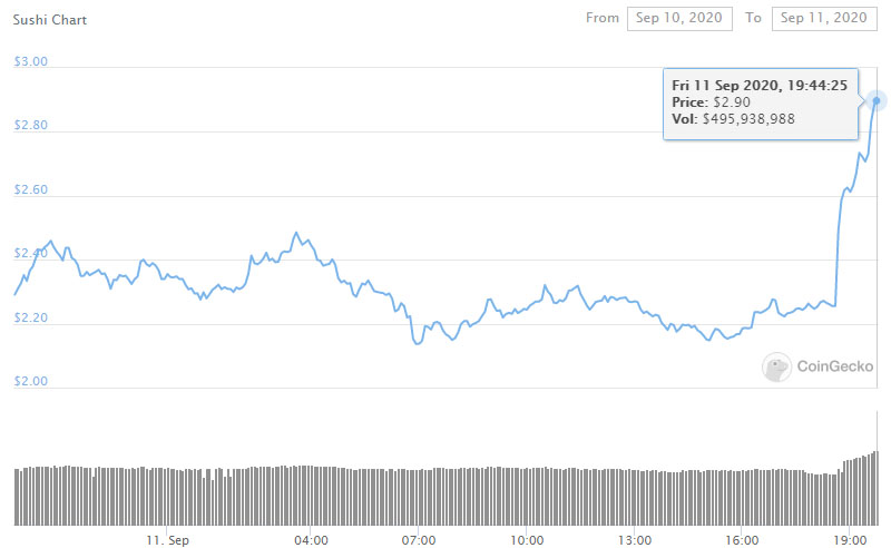 Токен SUSHI отреагировал ростом — цена монеты после сообщения о возврате средств подскочила почти на 27% до $2,9 на момент написания.