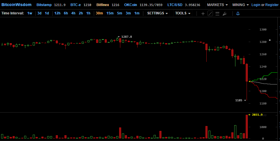 Кульминация наступила около 12:00 GMT, когда за короткий промежуток времени цена криптовалюты обвалилась до $1176 на бирже Bitstamp (на Bitfinex нижний порог составил $1185).
