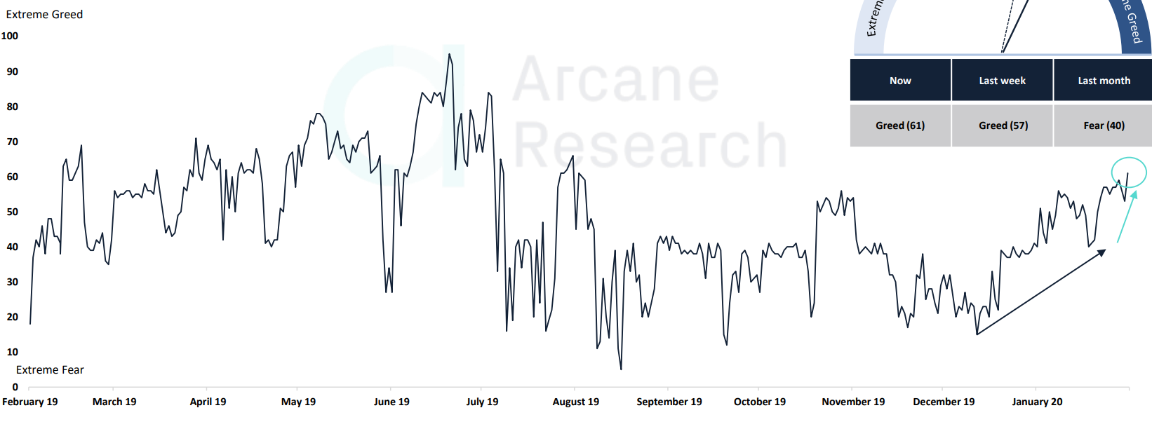 Напомним, в прошлом отчете Arcane Research говорилось, что криптовалютный «индекс страха и жадности» уже достиг августовских отметок.