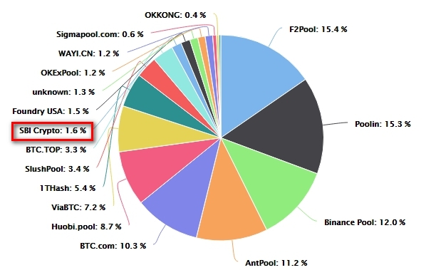 По данным BTC.com, на SBI Crypto Pool приходится 1,6% от общей вычислительной мощности сети биткоина. С хешрейтом около 2,4 EH/s он занимает 11 место в рейтинге пулов.