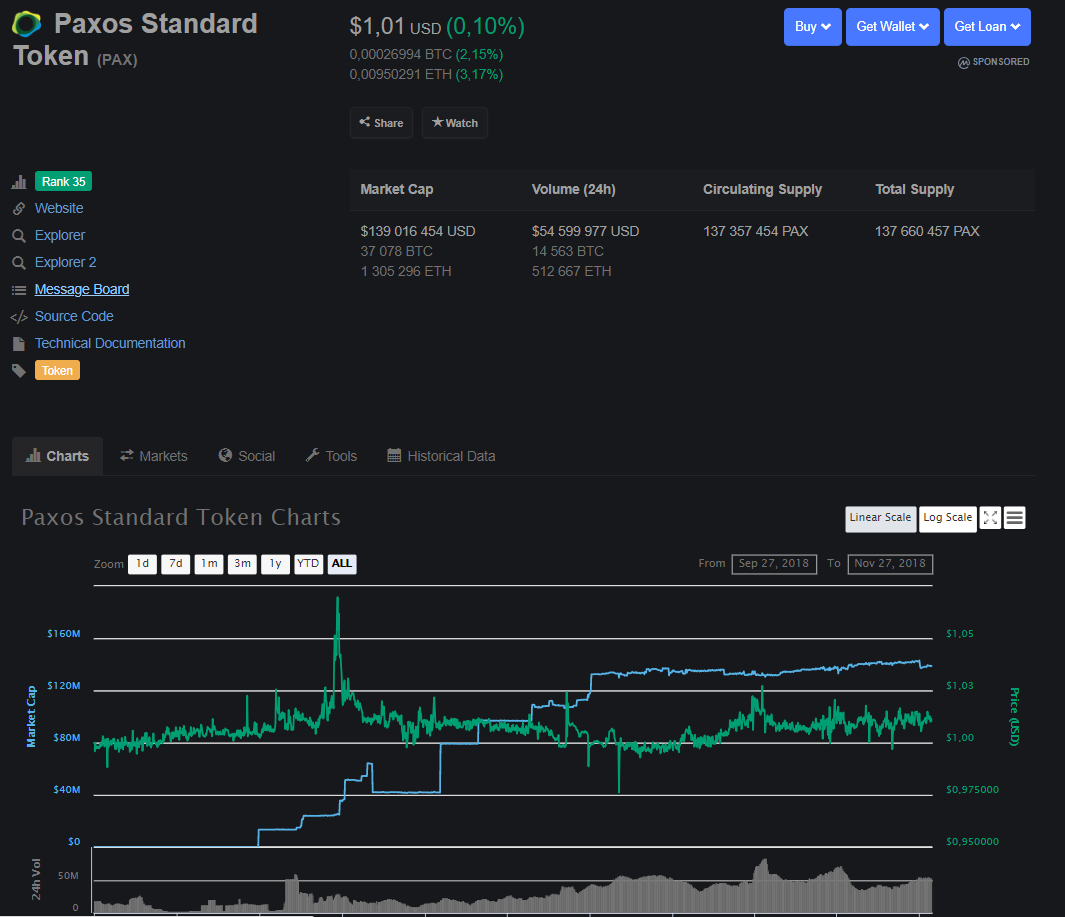 В настоящее время привязанная к доллару США «стабильная монета» Paxos находится на 35-ом месте рейтинга CoinMarketCap: