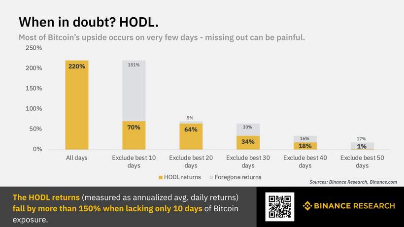 На диаграмме выше специалисты Binance Research продемонстрировали, как влияют лучшие дни на ежедневный доход от ходлинга в годовом исчислении. Так, за период с мая 2013 года, когда цена биткоина достигла $100, по сегодняшний день он составил 220%.