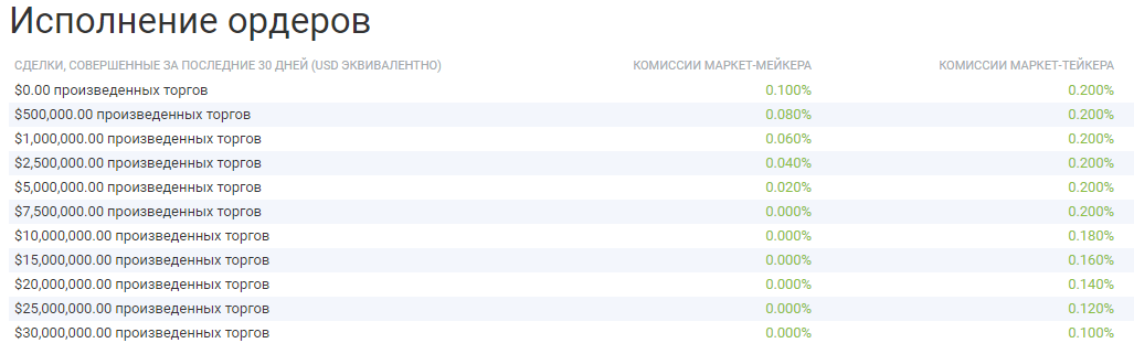 Так, например, если оборот за 30 дней превысил $300 млн, размер комиссии мейкера будет составлять 0%, тейкера — 0.095%. Больше оборот — меньше комиссии.