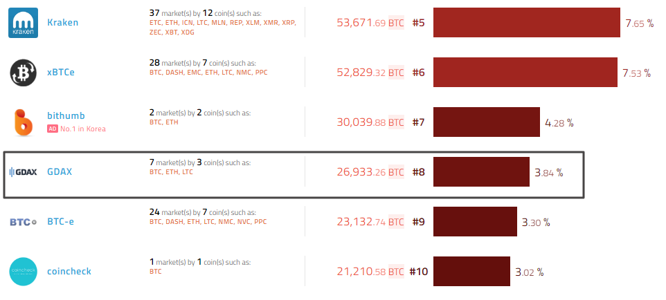 По данным сервиса coinhills, на данный момент биржа GDAX находится на 8-м месте по совокупному объему криптовалютных торгов (3,84% от глобального биржевого оборота):