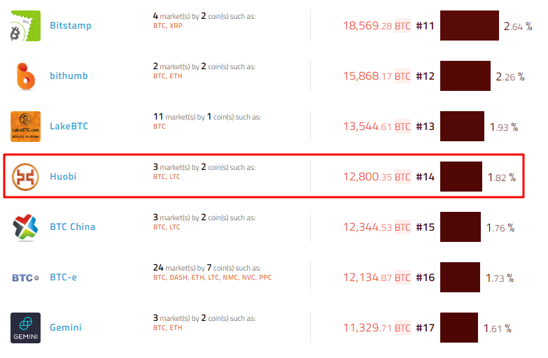 В настоящее время Huobi занимает 14 место по объемам биржевого оборота торгов криптовалютой и доля ее рынка составляет 1.82 %.