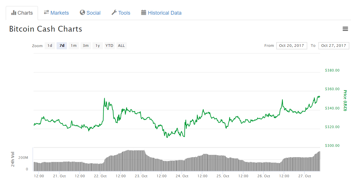 По состоянию на пятницу, 27 октября, цена Bitcoin Cash поднялась до недельного максимума. Так, на момент публикации средневзвешенный курс BCH, по данным Coinmarketcap, составлял $354.83, поднявшись за последние 24 часа более чем на 5%.