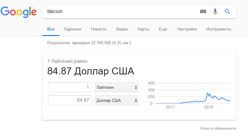 Система также автоматически отображает конвертер при запросах «биткоин», «Litecoin» и «Bitcoin Cash».