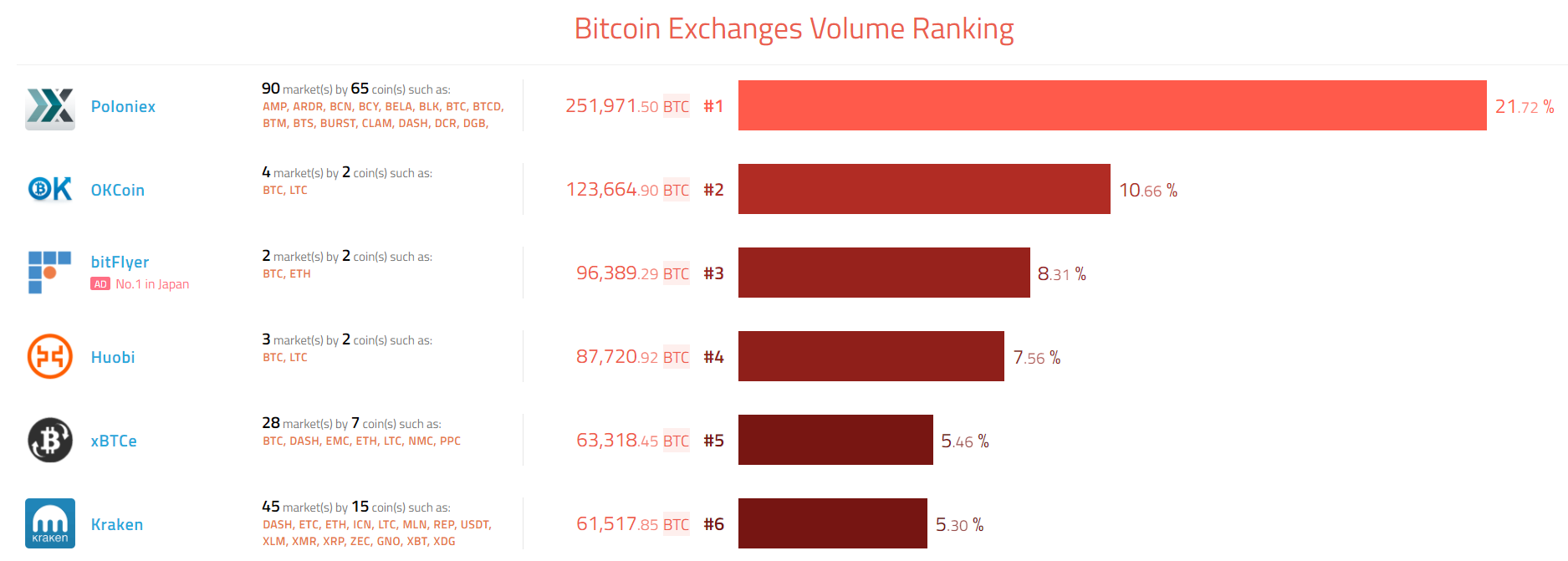 Одновременно с этим данные Coinhills показывают, что лидером по объемом торгов остается Poloniex, хотя по сравнению с несколькими днями ранее совокупная доля биржи из Делавэра снизилась до 21,72%.